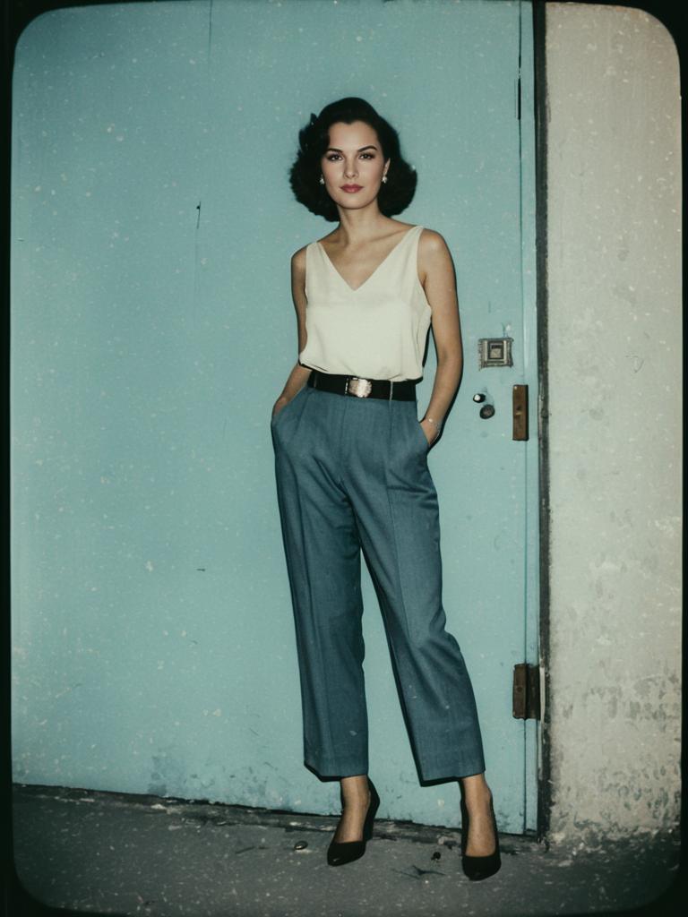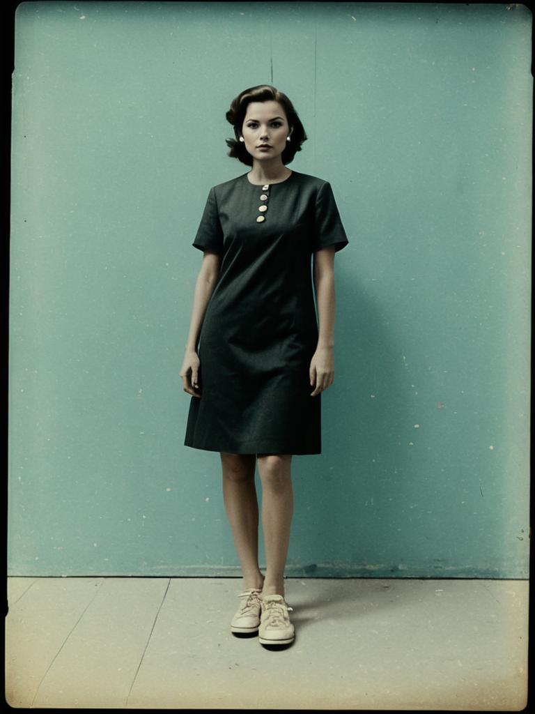 Woman, feminine casual, black crochet knit sweater with openwork detailing, three-quarter length sleeves, matching black inner lining, fitted at the waist, floral skirt in navy blue with large pink and red rose print, A-line cut, thigh-high length, visible pockets, neutral pose, grey studio background. --sref 1438