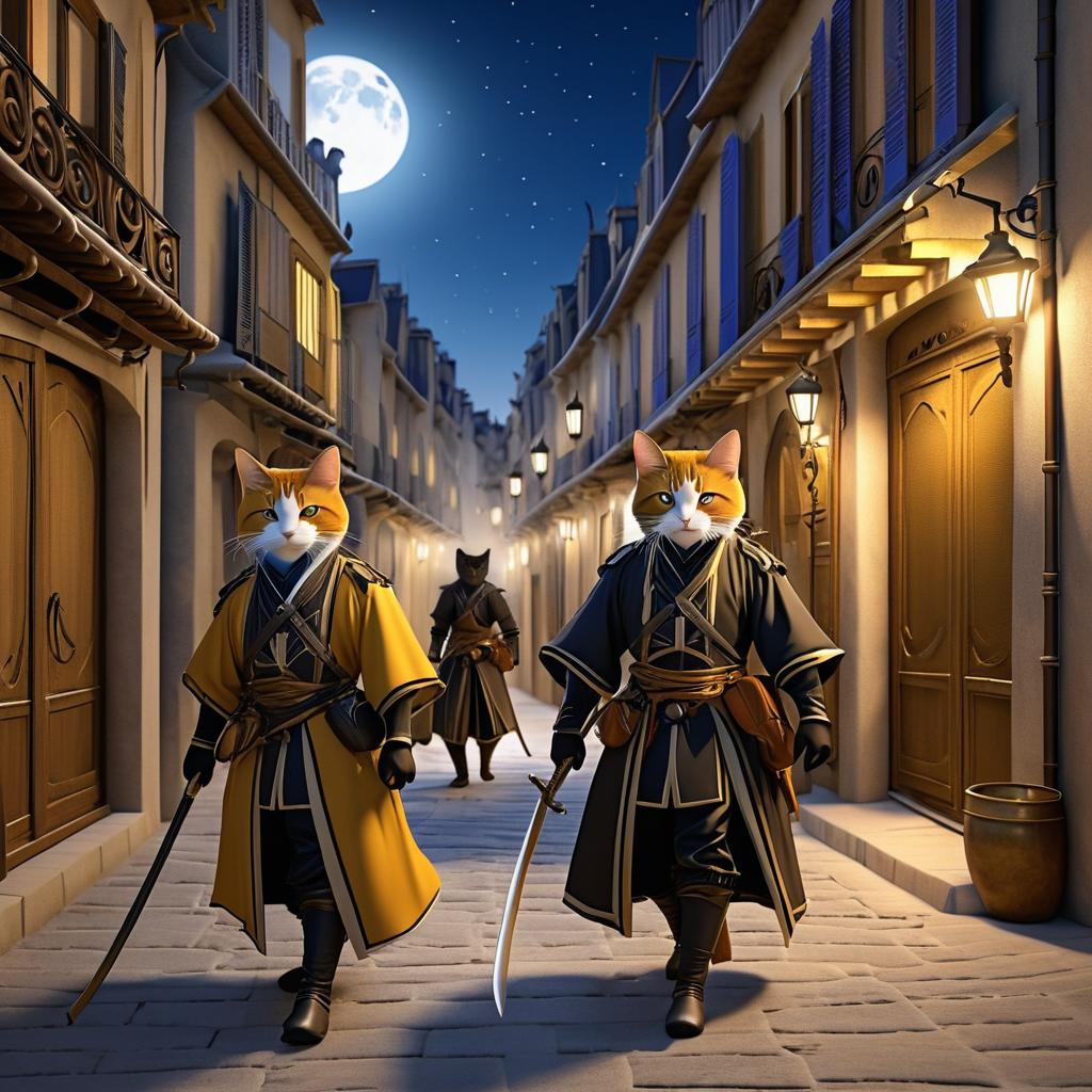 Street Samurai Deux dnd tabaxi en costumes belle époque se poursuivent à travers les toits. Dans lobscurité de la nuit, les rues de Paris sont calmes et silencieuses. La lueur de la lune baigne la ville dune lumière pâle, mettant en évidence les détails élaborés des vêtements des tabaxi et larchitecture complexe des bâtiments. Leurs poils se hérissent dans la brise fraîche, tandis que leurs queues frétillent danticipation. Lambiance est empreinte de mystère et dintrigue, alors que les tabaxi bondissent de toit en toit, leurs mouvements enveloppés de secret. Full action scene,