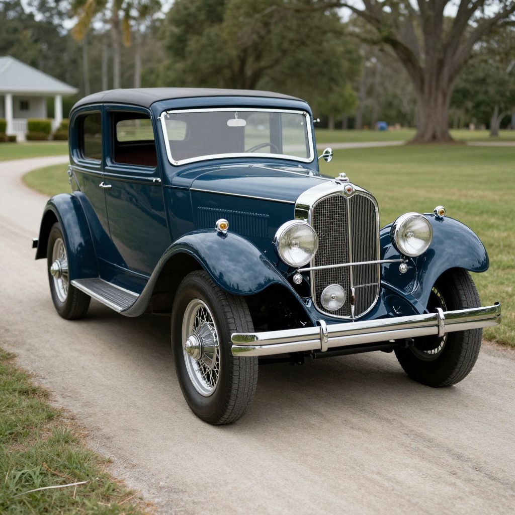Photograph of a classic, dark blue vintage sedan car with a shiny chrome grille and round headlights, parked on a gravel road. The car has a sleek, curved body with white wire-spoke wheels and chrome accents. The background features a grassy lawn, large trees, and a white house with a blue roof partially visible on the left. The car's windows are slightly tinted, and the overall style is reminiscent of early 20th-century automobiles, evoking a sense of nostalgia and elegance. The image is brightly lit with natural daylight.