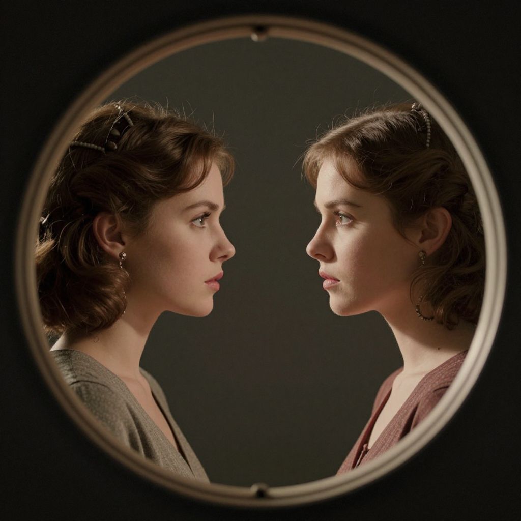 A high-definition digital artwork depicts two mirrored reflections of a woman gazing at each other through a circular porthole, symbolizing alternate selves from divergent timelines, rendered with dramatic lighting and a vintage aesthetic.