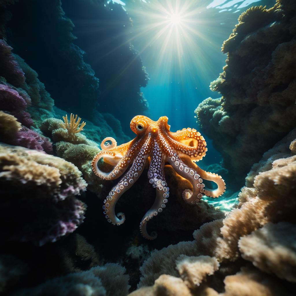 Photorealistic close-up of an octopus navigating a rocky underwater crevice, illuminated by natural sunlight filtering through the water. High detail view showcasing the octopus's textured skin, suckers, and vibrant colors in a coral reef environment.