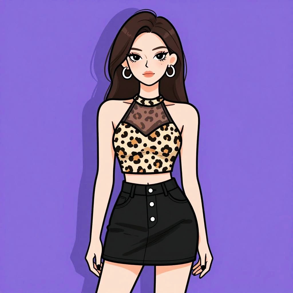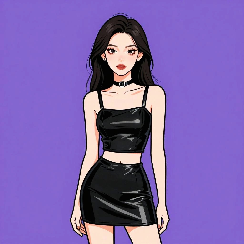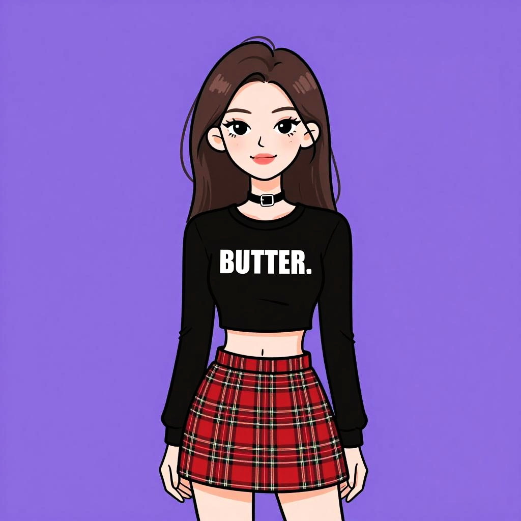 Woman with pretty face and pretty hair. Woman, casual, black long-sleeved crop top with bold white text, plaid mini skirt in red and black, choker necklace. --sref 1467