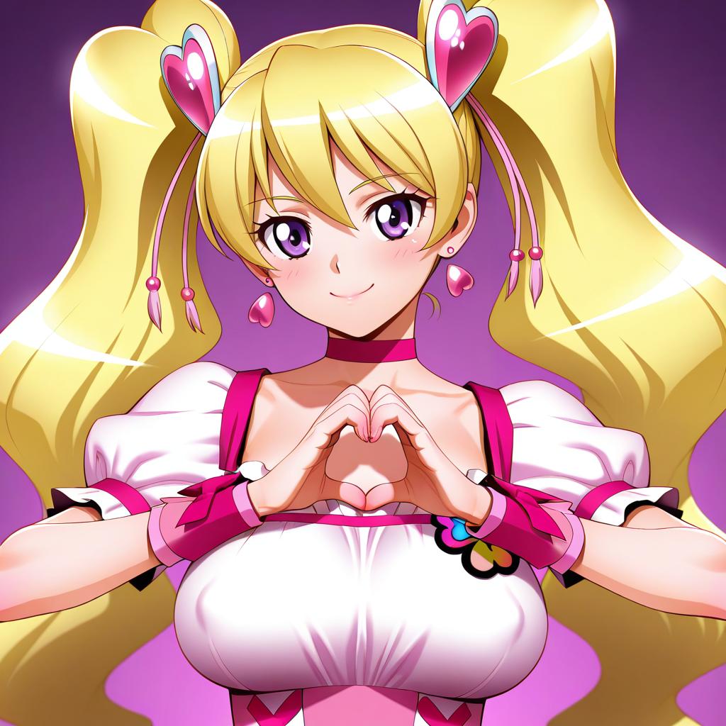 Anime-style illustration of a magical girl character with long blonde twintails adorned with pink heart hair ornaments. She has vibrant pink eyes and wears a white and pink outfit with puffed sleeves, a pink choker, heart-shaped earrings, and matching pink wrist cuffs. The character is making a heart shape gesture with her hands against a purple gradient background.