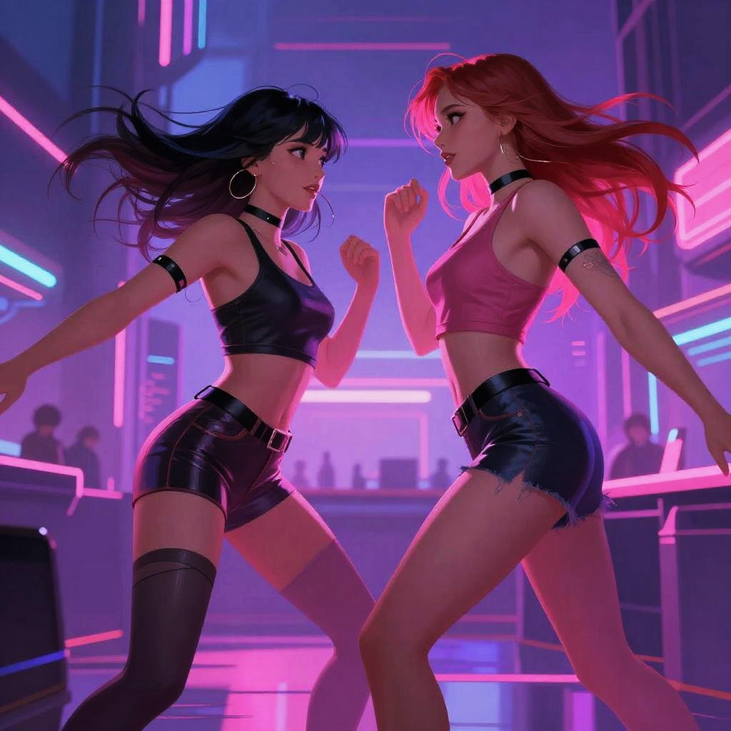 Digital artwork of two women in neon-lit club, wearing black leather crop tops and shorts, facing off in a dynamic dance pose.