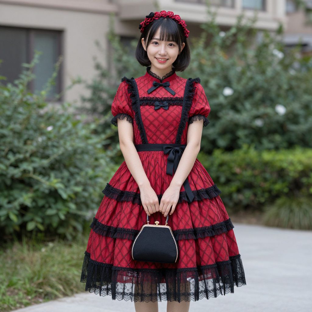 Smiling woman wearing a vibrant red and black lattice flouncing sweet Lolita dress stands outdoors, holding a small black purse with gold accents, set against a backdrop of green shrubs and a residential building.