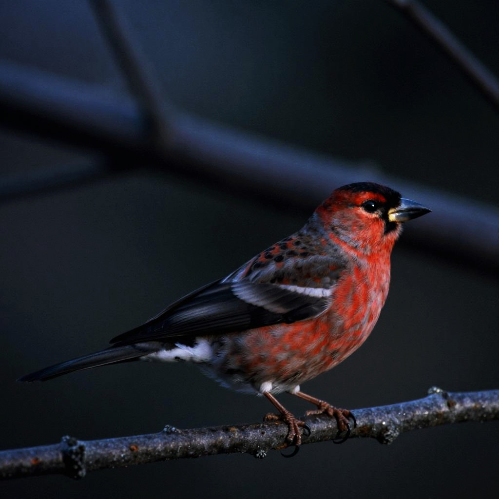 Close-up photo of an Evening Grosbeak bird perched on a branch against a dark, blurred background. The bird displays distinctive plumage with vibrant red, black, white, and brown feathers. Detailed textures and atmospheric lighting highlight the bird's features and natural habitat.