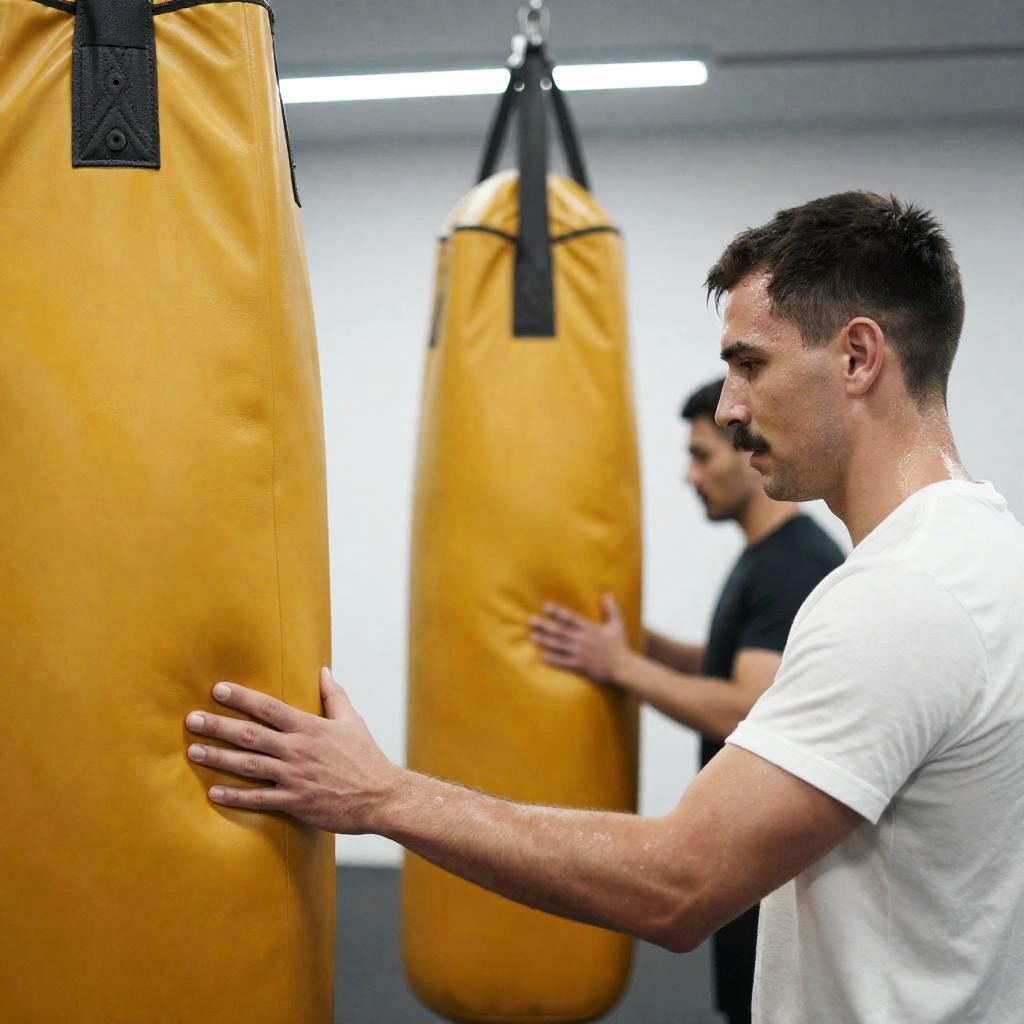 Photograph of two men in a gym. Foreground man in white shirt, mustache, slightly sweaty, looking at yellow leather punching bag. Background man, partially visible, in profile, facing bag. Bright indoor setting, fluorescent lights. Bag hangs from ceiling.