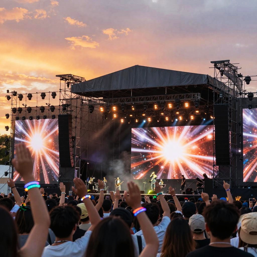 Headliner performing on a giant outdoor festival stage during sunset, the crowd waving hands and glowing wristbands, dramatic orange and pink skies, massive speaker stacks and LED screens displaying dynamic visuals behind the band, joyous festival vibe.