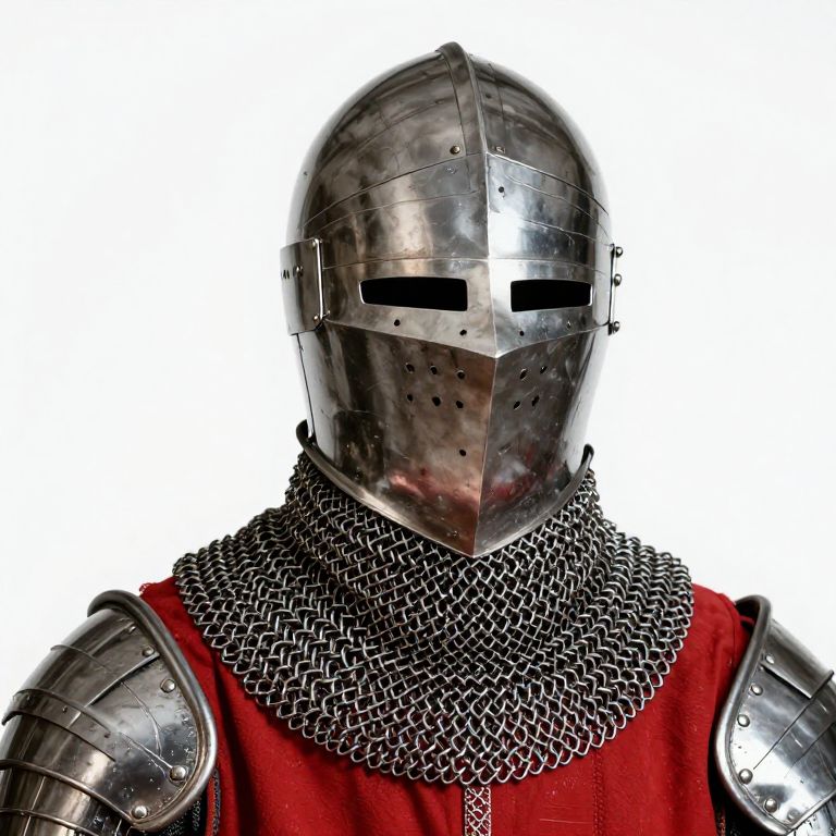 Photograph of a medieval knight in full armor against a white background. The knight wears a reflective, silver steel helmet with a narrow eye slot and small rectangular cutout for the mouth. A chainmail coif covers the neck and collar area. The chest plate is bright red, contrasting with the metallic armor. The shoulder armor is also silver steel, with rivets visible. The chainmail is intricately linked and extends to the upper chest. The image has high contrast and sharp details, highlighting the textures of the metal and chainmail. The knight's face is obscured by the helmet.