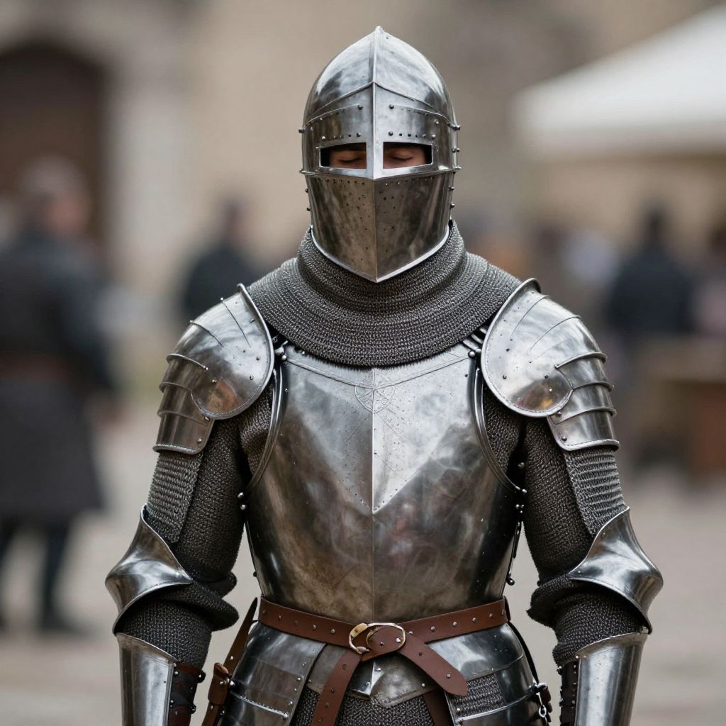 Photograph of a medieval knight in shiny steel armor, including a helmet with black eye slits, chainmail neck guard, and red tunic,