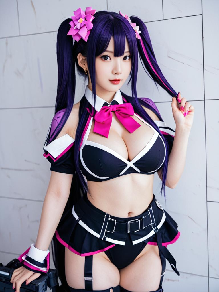 Photo-realistic cosplay photo of person in architect (girls' frontline) costume. 1girl, pink eyes, purple eyes, black hair, very long hair, side ponytail, hair ornament, medium breasts, large breasts, cleavage, navel, collarbone, bare shoulders, pink nails, nail polish, one side up. full body shot