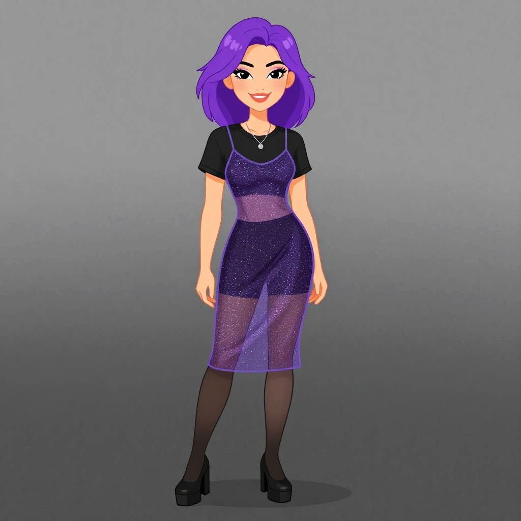 Digital drawing of a smiling woman with vibrant purple hair, fair skin, and black eyes. She wears a black short-sleeved top under a sheer, purple polka-dotted dress that reveals black tights and black platform heels. A small necklace with a pendant adorns her neck. The background is a plain, gradient gray. The art style is cartoonish with bold lines and bright colors, emphasizing a cheerful and stylish appearance. The woman stands confidently with her arms relaxed at her sides.