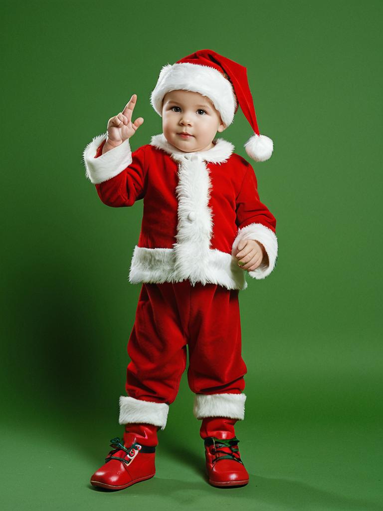 Grinch infant santa costume, solo, 1boy, male focus, hat, santa hat, realistic, standing, green background, full body, shoes, christmas, red footwear, santa costume, simple background, looking at viewer, briefs