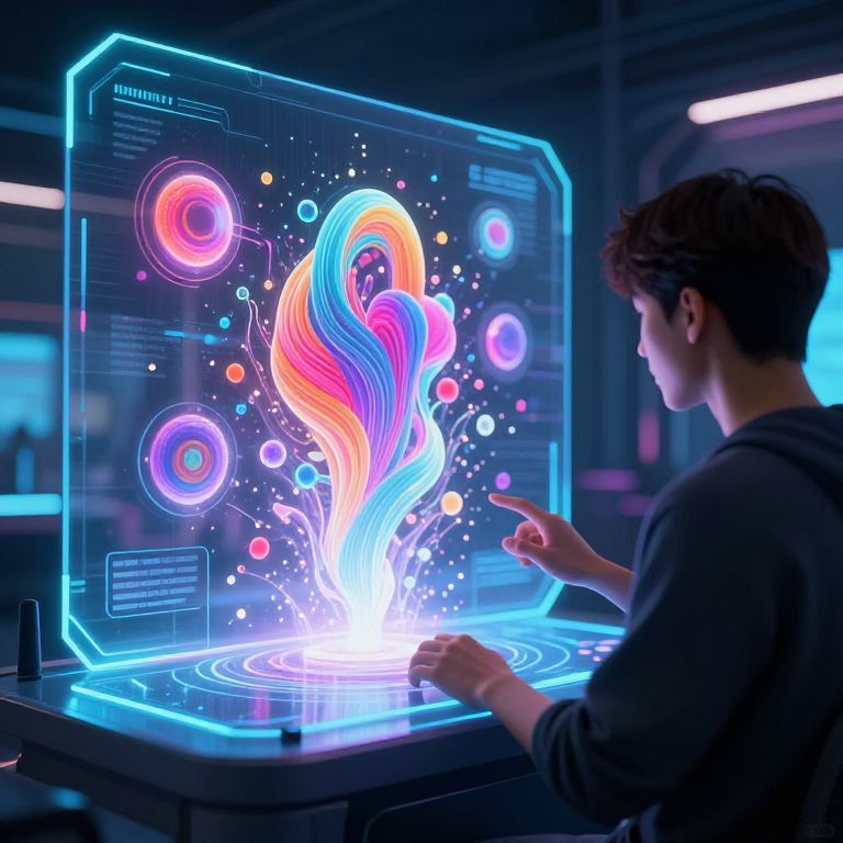 A digital CGI image depicts a young man with curly brown hair, wearing a dark hoodie, interacting with a futuristic, holographic interface. The hologram, glowing with vibrant neon colors, features a swirling, abstract design in pink, blue, and orange, with smaller, colorful circles around it. The man points at the hologram, which is projected onto a glowing blue, circular platform. The background is a dark, sci-fi lab setting with blurred, neon-lit equipment. The hologram and platform are outlined in bright blue, contrasting with the dark surroundings. The overall mood is futuristic and tech-savvy.
