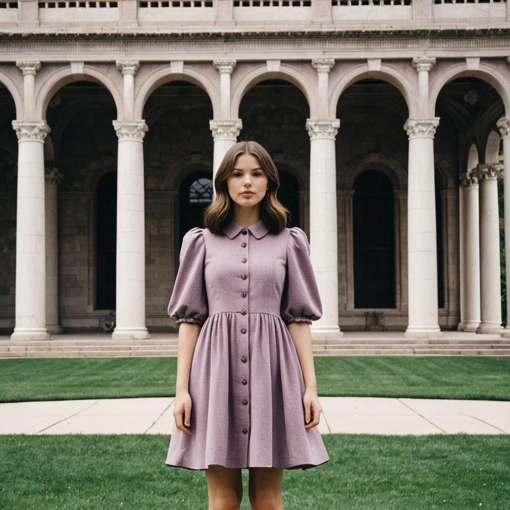 Dress like reformation, photograph of a young woman standing in front of an ornate, classical-style building, wearing a mauve, button-down dress with puffed sleeves, brown hair, neutral expression, grassy lawn in foreground, beige stone building with arches and columns in background, daytime, realistic style, detailed ures, natural lighting, slight shadow, symmetrical composition