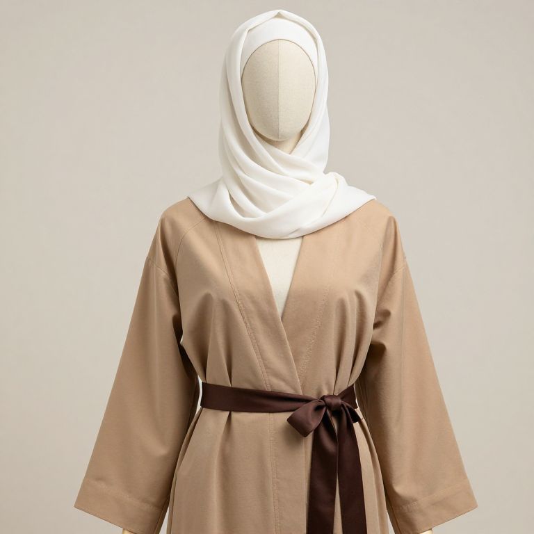 Mannequin wearing a tan robe with a brown belt and a white headscarf.