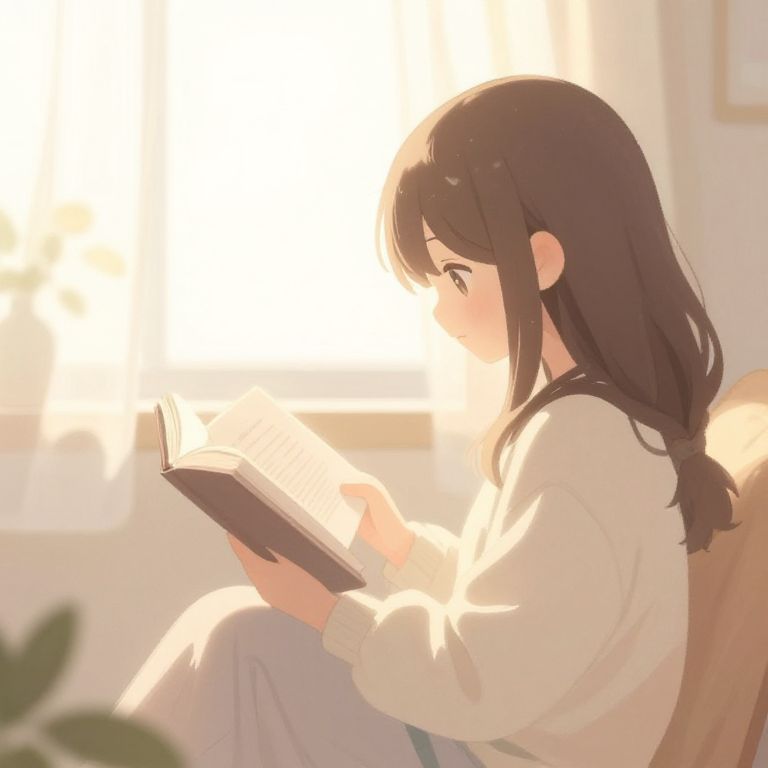Soft anime art depicting a cozy indoor setting with a character reading a book by the window, sunlight filtering through sheer curtains, warm tones and gentle textures, rounded soft linework, focus on comforting and intimate environment, pastel and muted colors