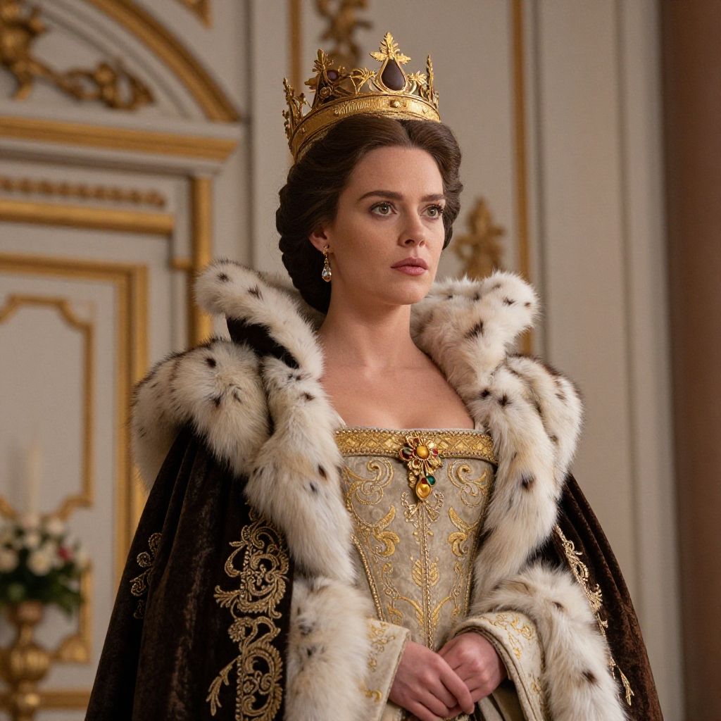 A regal woman dressed in a richly detailed queen costume inspired by cinematic realism, adorned with a gold crown, luxurious fur trim, and intricate embroidery. The editorial portrait captures her majestic and poised demeanor against an opulent background, emphasizing historical elegance and grandeur.