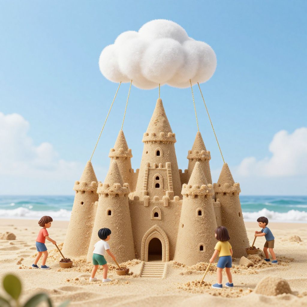 A whimsical 3D-rendered scene depicts children playing on a sandy beach as they construct a fantastical sandcastle anchored to a cloud by golden ropes, blending imaginative fantasy with vibrant realism under bright, clear skies.