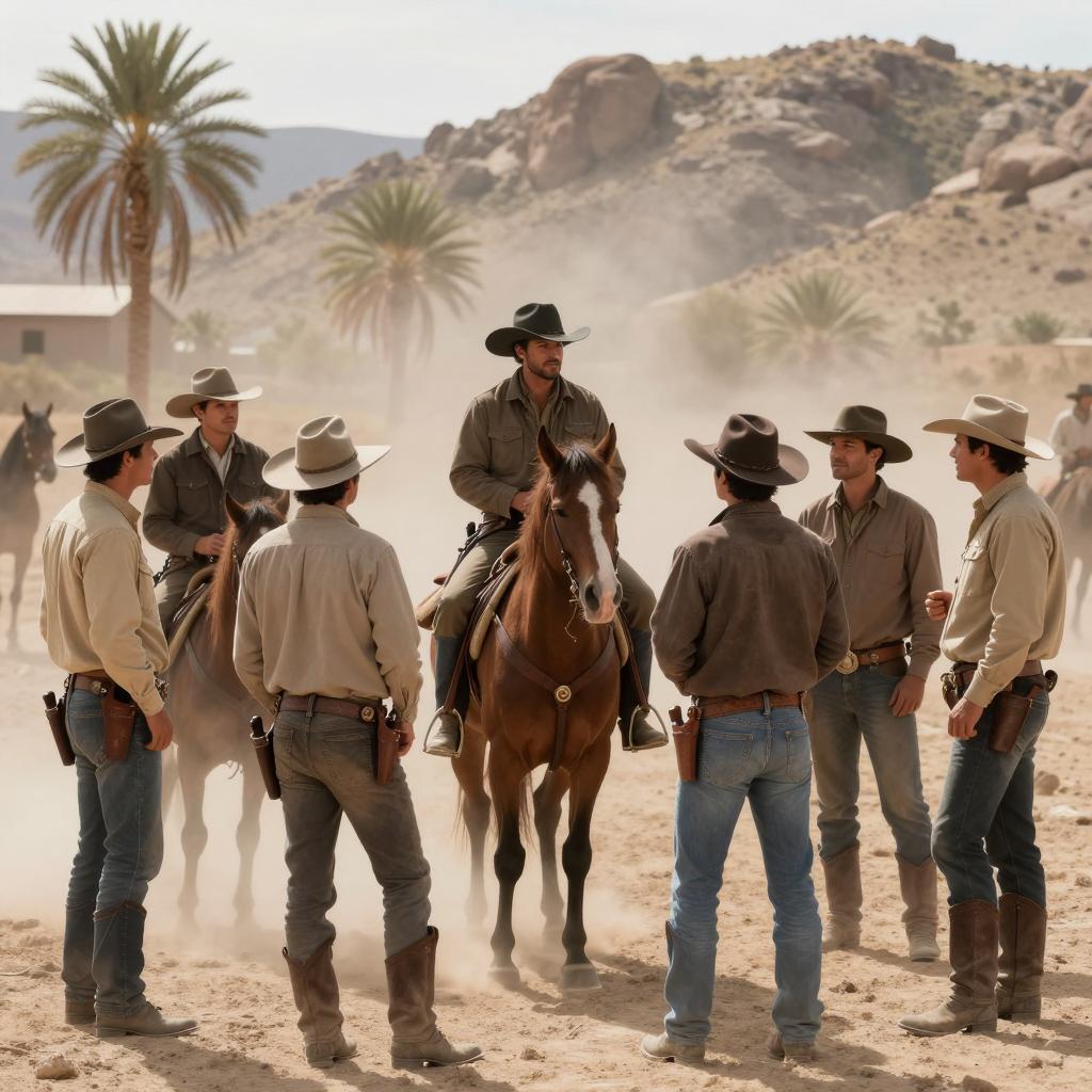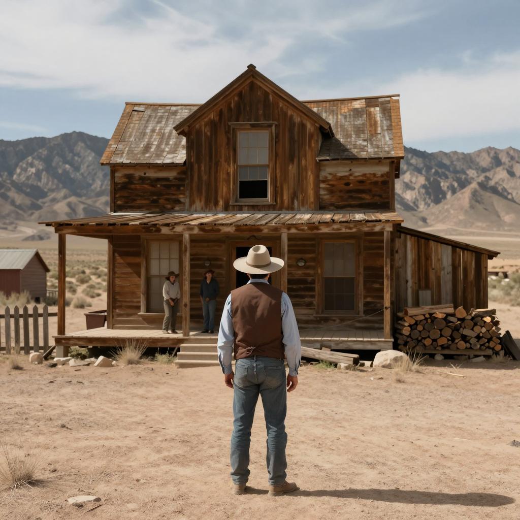 Western photograph. A lone man in a brown vest, blue shirt, and wide-brimmed hat stands in the foreground, facing an old, weathered wooden house with a porch. The house is surrounded by desert and mountainous terrain. Two people stand on the porch. The man's back is to the camera. A wooden fence and stacks of firewood are to the right of the house.