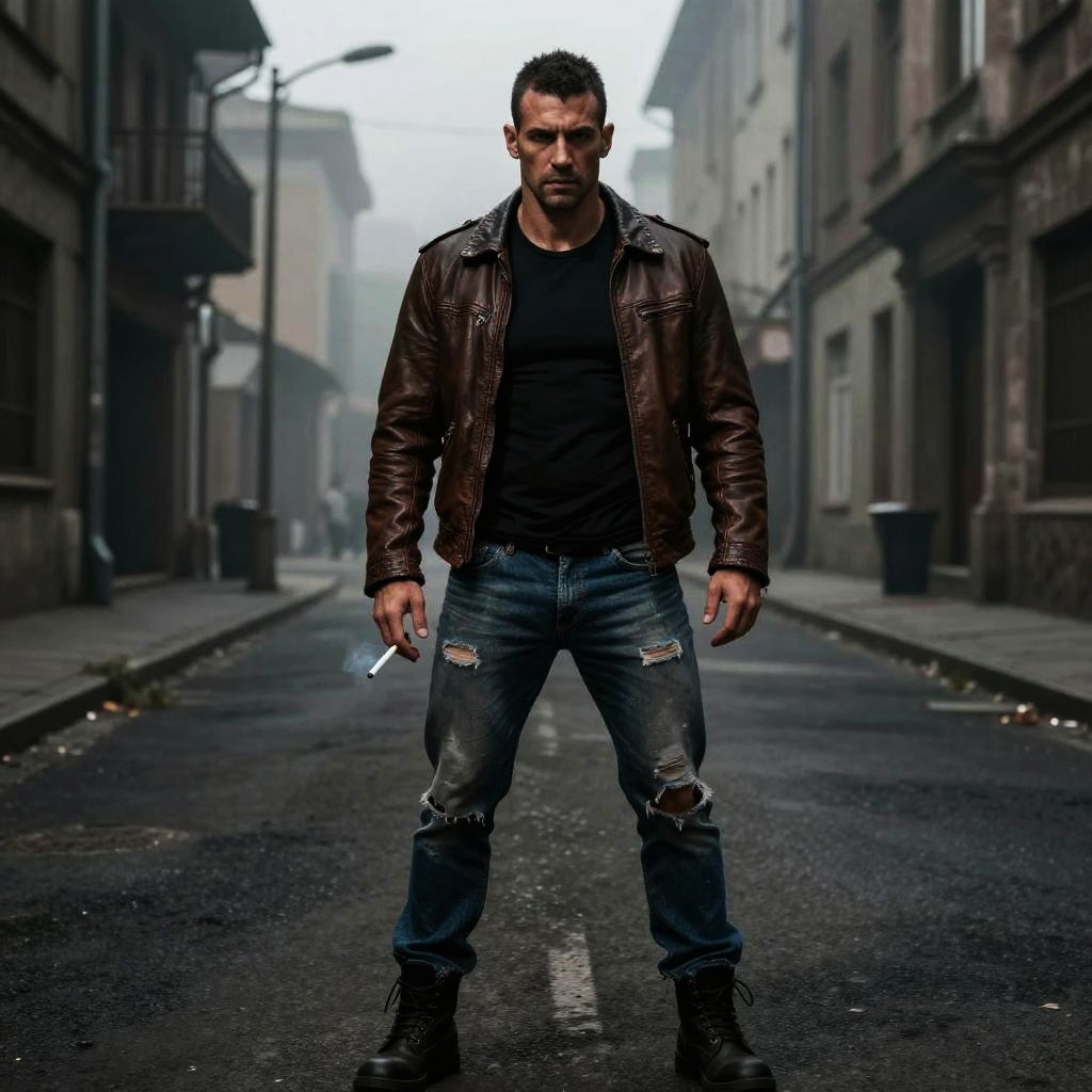 Photograph of a muscular, bearded man with short dark hair, intense expression, wearing a black t-shirt and dark denim jacket, standing in a