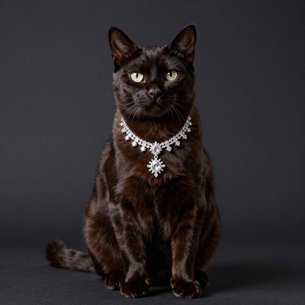Luxurious studio portrait of a Japanese Bobtail cat sitting upright, glossy dark fur, wearing an ornate sparkling diamond necklace, clean dark background with spotlight, high-end fashion pet photography, high resolution, ultra-detailed