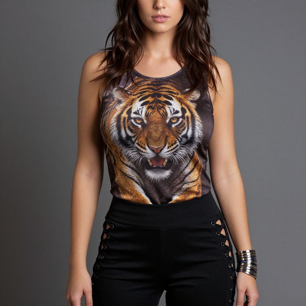 Photograph of a young woman with light skin and long dark hair, walking in a dimly lit indoor space. She wears a black tank top with a vivid, detailed tiger face print in orange, white, and black, and high-waisted blue jeans. A tan leather shoulder bag is slung across her right shoulder. The background is blurred, emphasizing her outfit. Her expression is neutral, and she stands with a slight forward lean. The image focuses on her upper body and jeans, with the tank top's tiger design being the most striking feature.