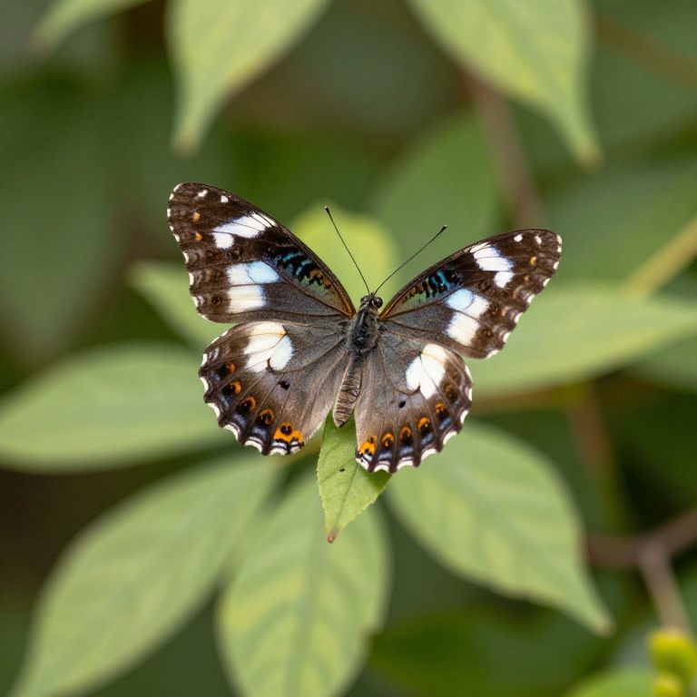 Photograph of a black and white butterfly with blue spots, perched on a green leaf against a blurred green foliage background.