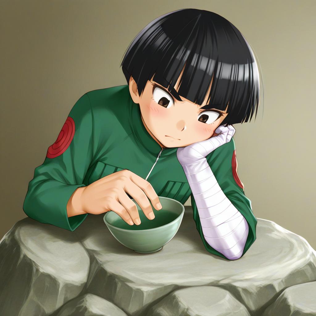 Rock lee, naruto (series), 1boy, black eyes, thick eyebrows, black hair, short hair, bowl cut, bandaged hand, bandaged arm, by artist kasuga yukihito, illustrious