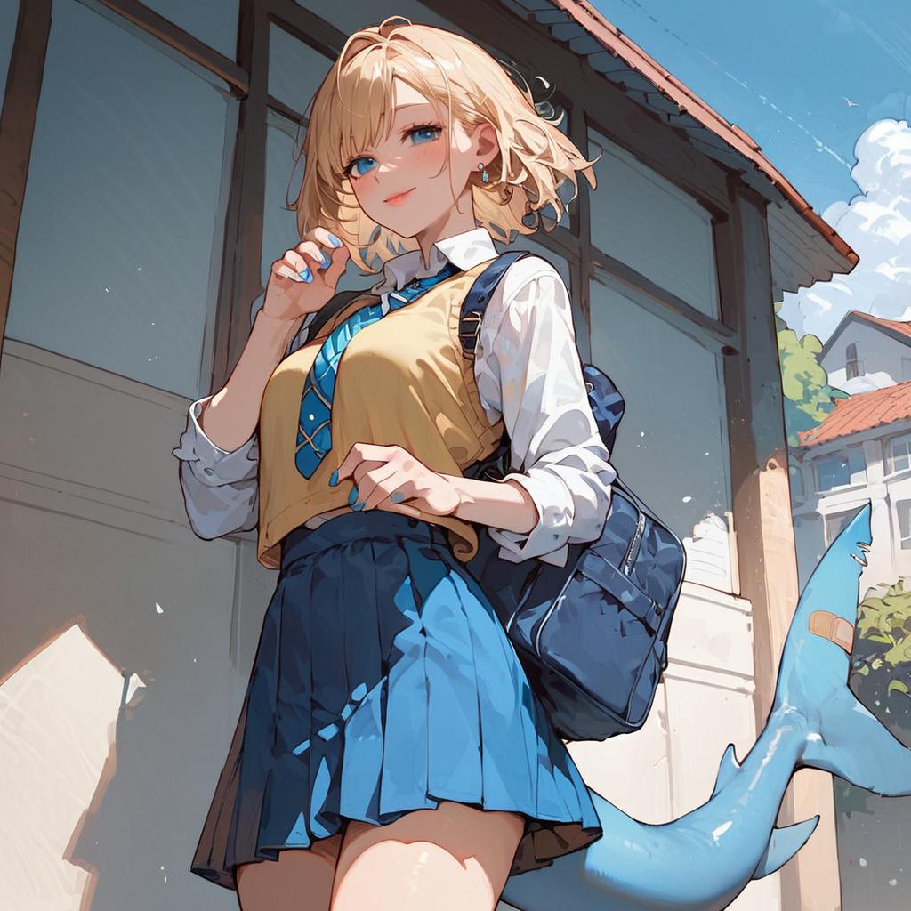 Score_9, score_6_up, source_anime, 1girl, solo, school building, outdoors, gura_school, blue skirt, collared shirt, necktie, yellow vest, bandaid, shark tail, blue nails, light smile, tall