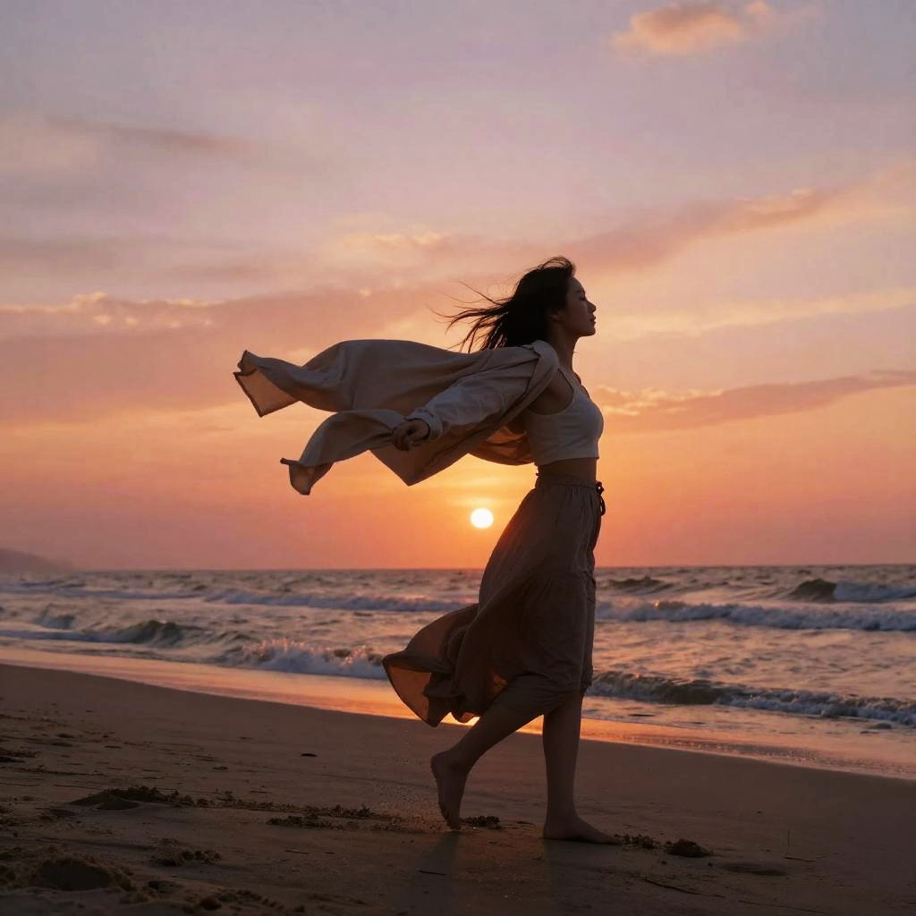 Removing clothes on a windy beach at sunset, vibrant orange and pink sky, flowing garments caught mid-air, dynamic movement and freedom, sandy shore with gentle waves, capturing the essence of liberation and nature’s embrace in soft warm tones.