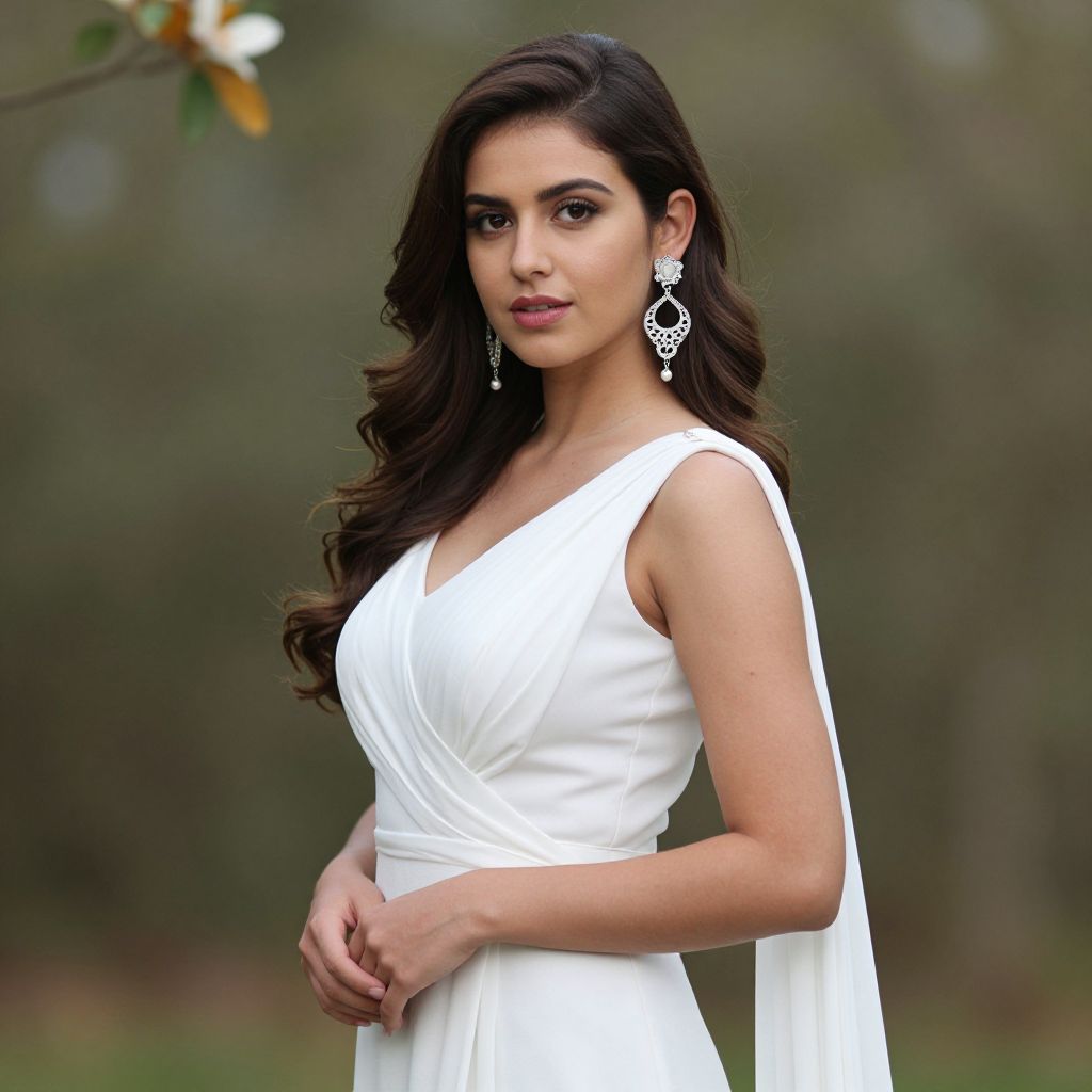 Formal gown indo western, 1girl, solo, dress, white dress, jewelry, earrings, long hair, blurry, looking at viewer, flower, brown hair, blurry background, outdoors, realistic, breasts, brown eyes
