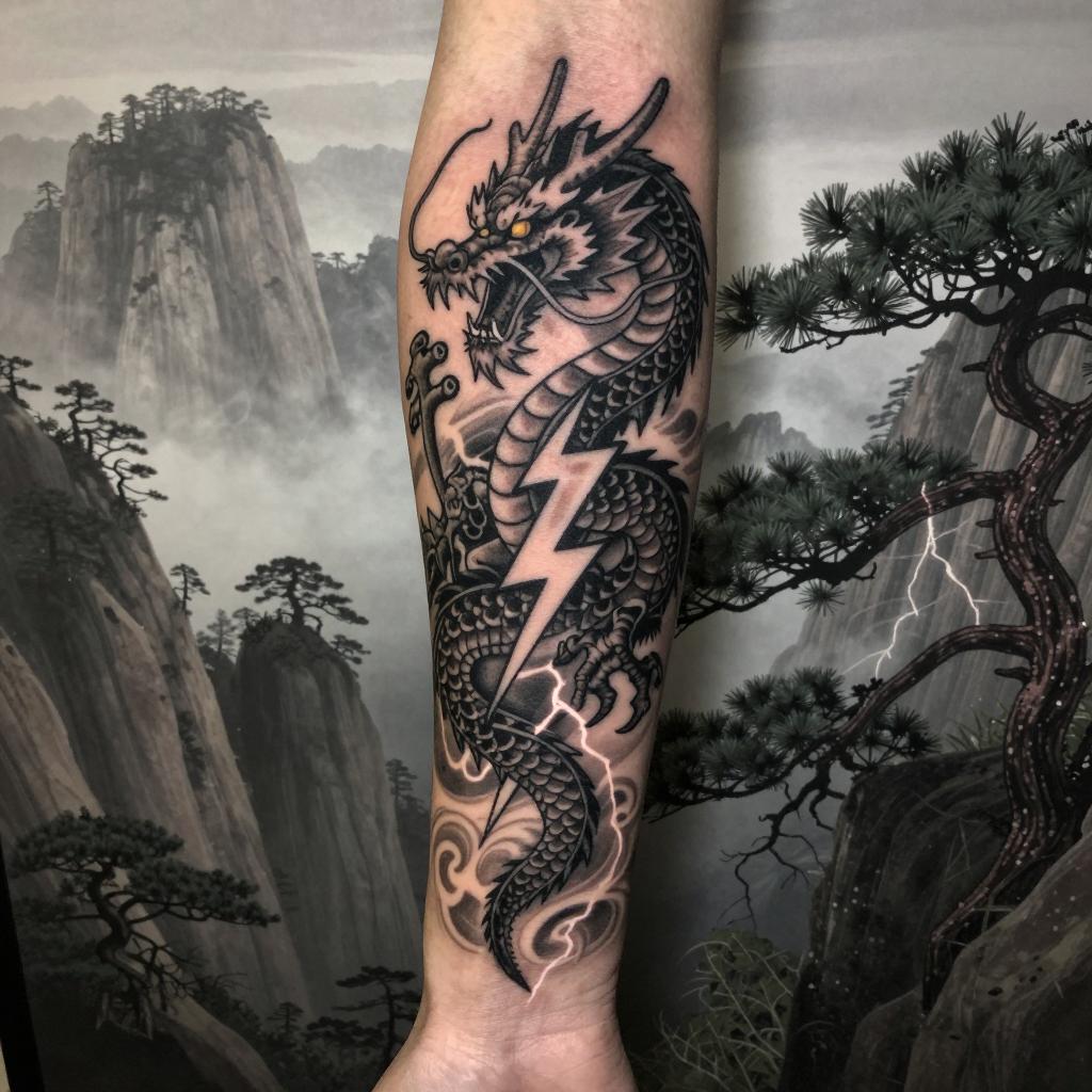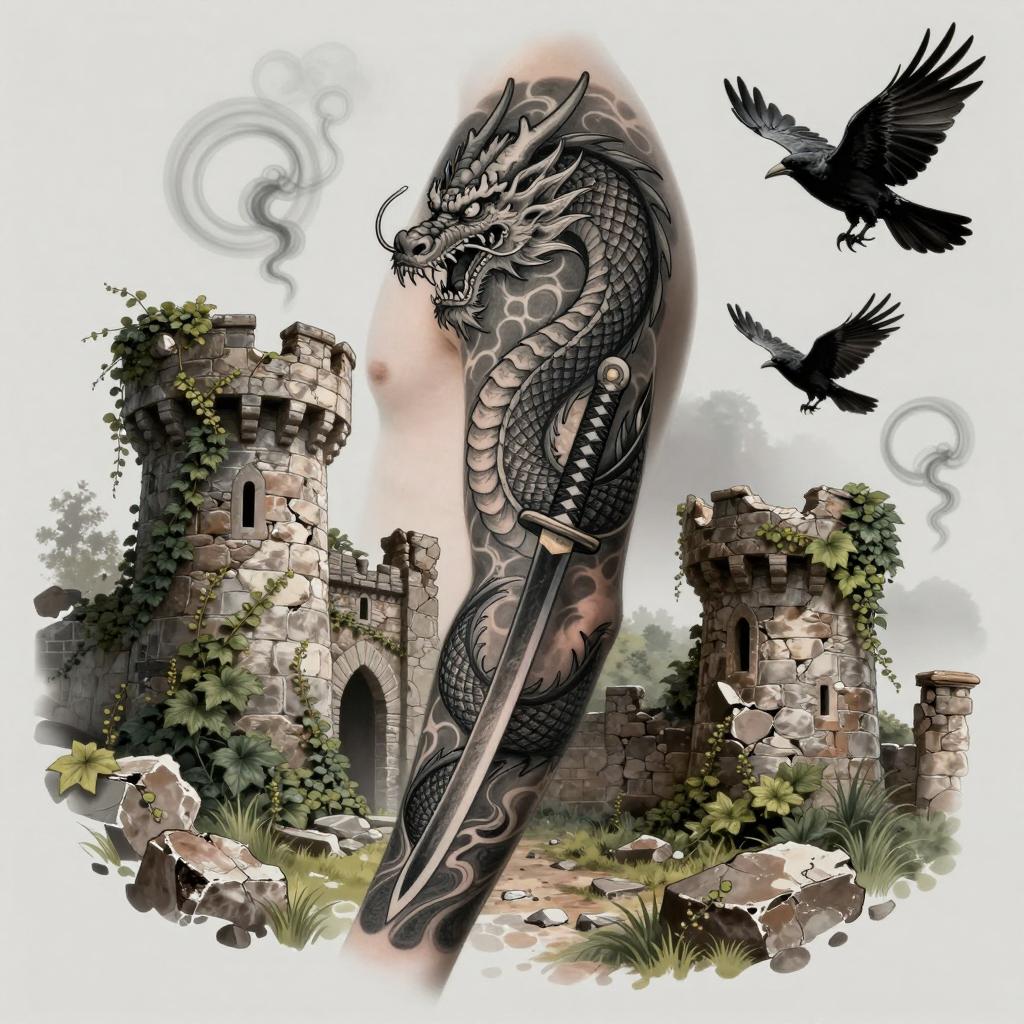 A bold black ink full-arm sleeve tattoo featuring dragon coiling around a katana, set against crumbling stone fortress with ivy vines, and accented by flaming maple leaves and geometric tribal patterns.