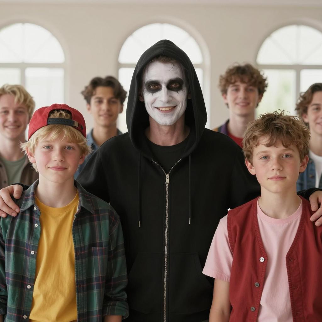 Photograph of a movie poster. A large, detailed, wrinkled alien face with a black hat dominates the upper right. Three human faces in the foreground: a young girl with blonde hair and blue eyes in the center, a young boy with curly brown hair to the left, and a man with short black hair and a beard to the right. The background is dark and blurred. The alien's expression is menacing. The people have neutral to slightly concerned expressions. The man is wearing a red shirt.