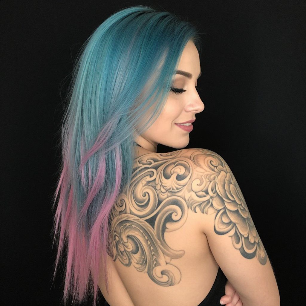 Photograph of a woman with turquoise and pink dyed hair, viewed from the back. She has a large, intricate tattoo covering her upper back and shoulder, featuring swirling patterns and a detailed floral design. She's turning her head to the right, smiling slightly. The background is solid black, making her colorful hair and tattoo stand out. She has fair skin and her arm is crossed over her chest.