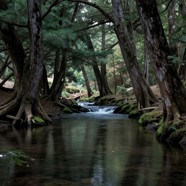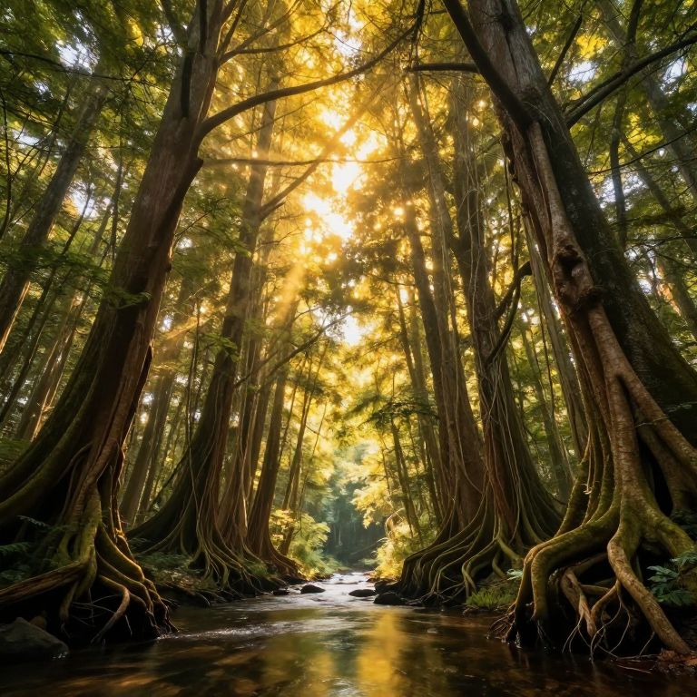 Majestic trees stand inverted in a mystical forest, their sprawling roots extending upwards toward a radiant canopy of golden lights, while a serene stream reflects the ethereal glow below.