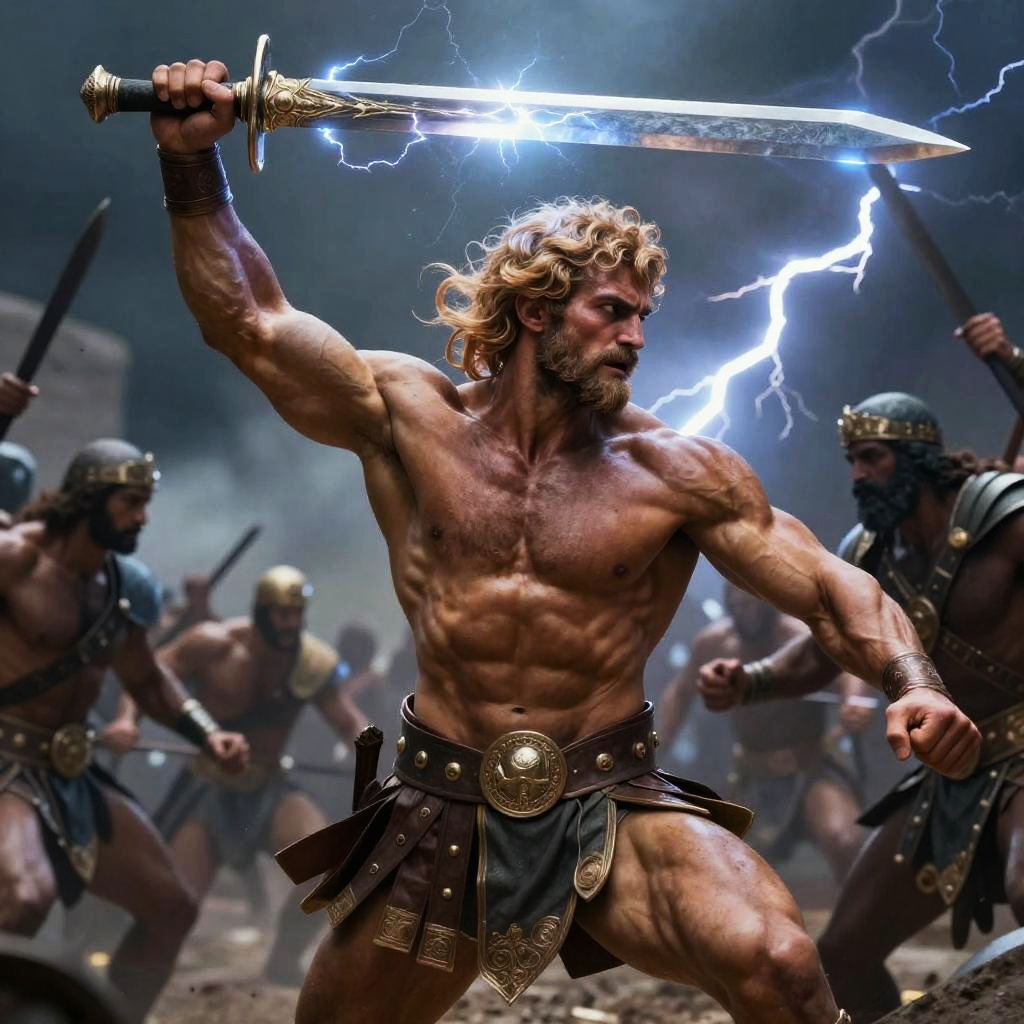 Muscular Greek god engaged in battle, mid-motion with glowing sword raised high, intense expression, lightning crackling behind him, dynamic and cinematic scene capturing raw power and mythic grandeur