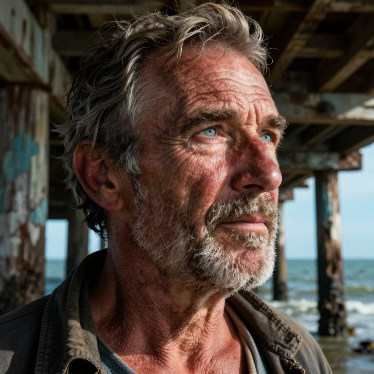 Create an ultrarealistic portrait from a low-angle perspective of a seasoned sailor, his face weathered by time and the elements, as he gazes contemplatively toward the horizon. Blend elements of impressionism with high-detail realism to evoke a sense of nostalgia and introspection. Capture the interplay of light and shadow across his sun-kissed skin, accentuating the fine lines and a distinguished five-o'clock shadow. Set against the rugged backdrop of an abandoned pier, with peeling paint and worn wooden planks, his kind blue eyes stand out, holding a lifetime of stories untold. Every crease and scar on his face tells a tale of adventure and perseverance, inviting viewers into a world of reflection and untold journeys.