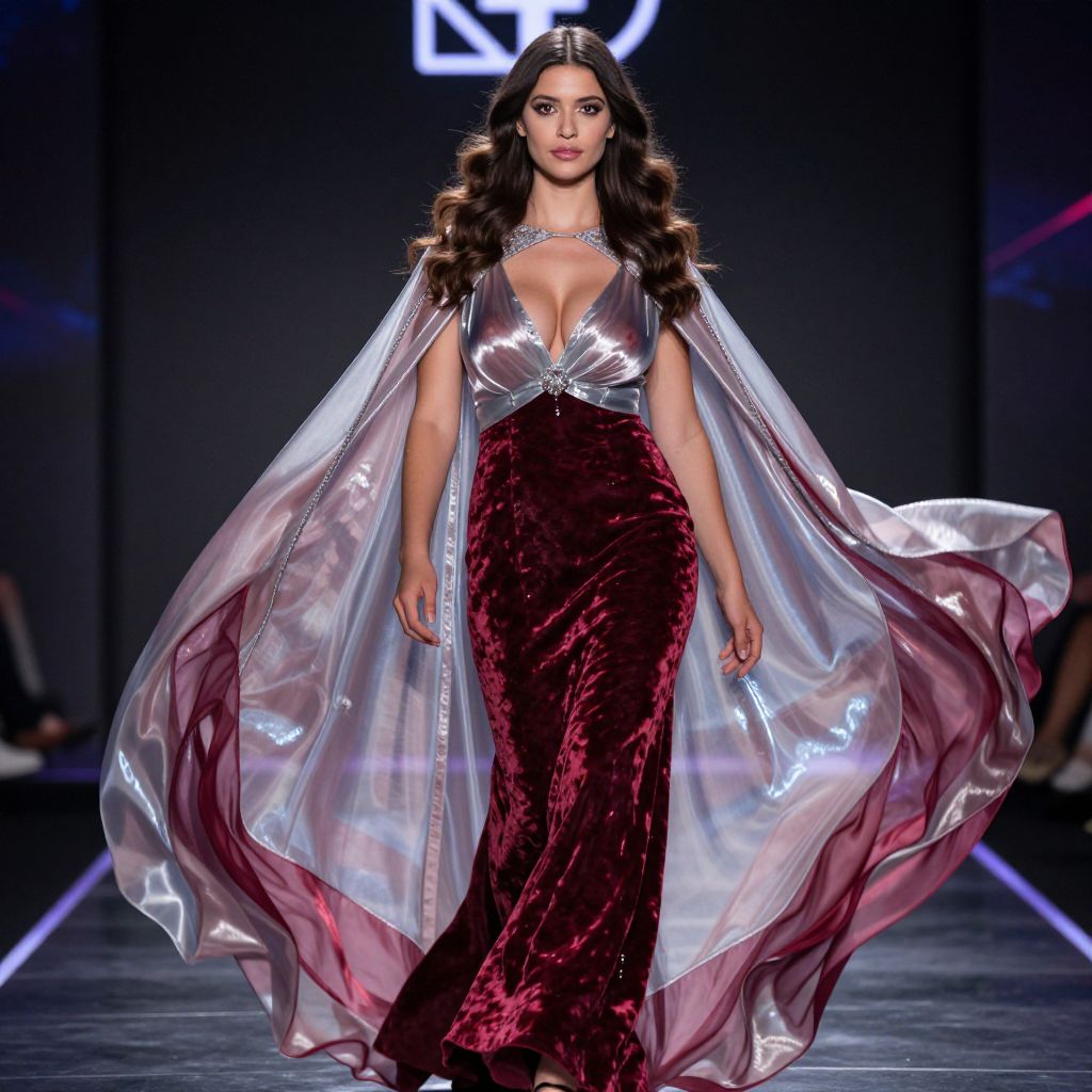 A stunning woman in her late 20s with long wavy brunette hair and expressive, deep brown eyes stands on a luxurious midnight runway, wearing a dramatic cape gown hybrid that flows dramatically with her movement. The gown combines a flowing, ethereal cape with a structured gown silhouette, made of sheer silver and deep red velvet, as she strides forward with confidence, the light catching the fabric in dynamic motion, setting against a dark, glowing stage backdrop with subtle neon accents.. The woman has big tits and cute face