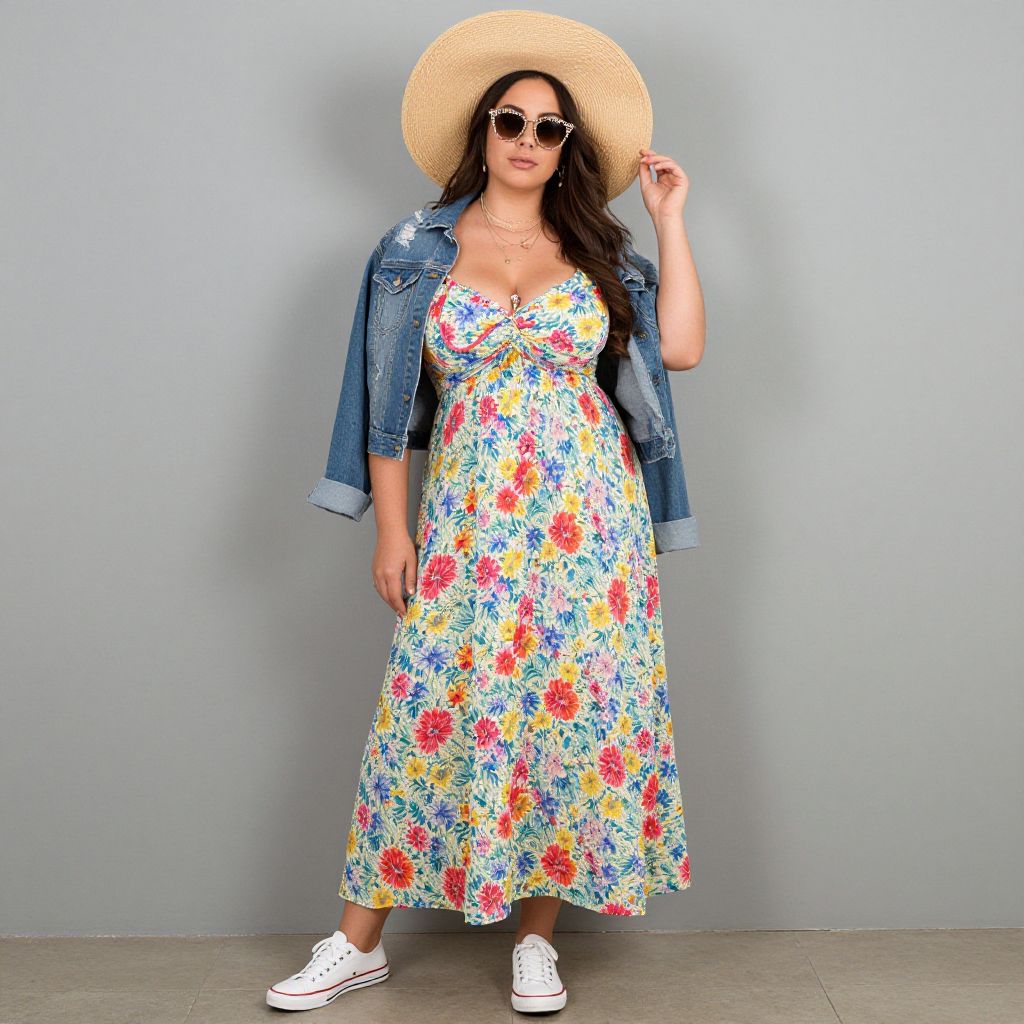 Full body shot, Plus-size woman, lightweight cotton sundress, floral print, vibrant colors, sleeveless design, cinched waist, flowy skirt, paired with denim jacket, distressed details, rolled-up sleeves, comfortable white canvas sneakers, oversized straw hat, wide brim, woven texture, chic sunglasses, delicate gold jewelry, layered necklaces, bohemian vibe, relaxed summer aesthetic Sexy. Pretty face and beаutiful eyes. Big breasts