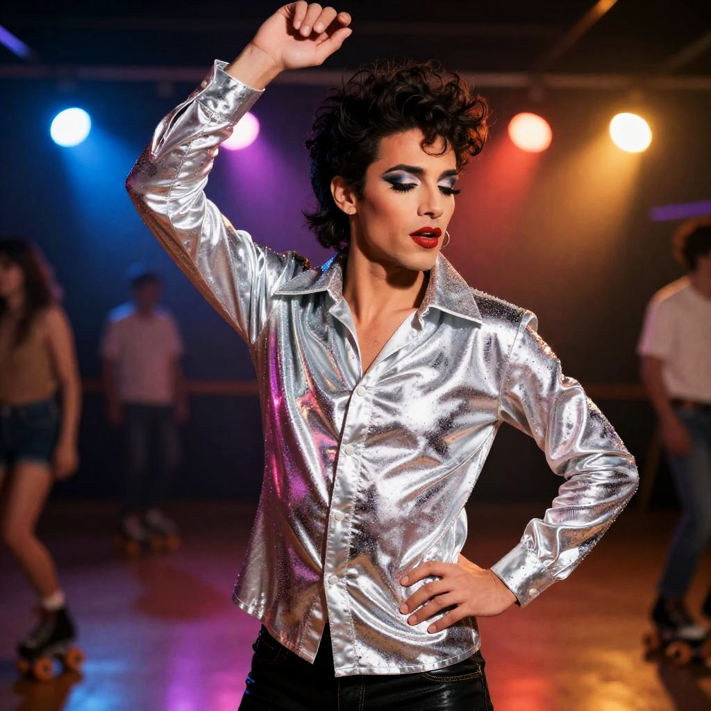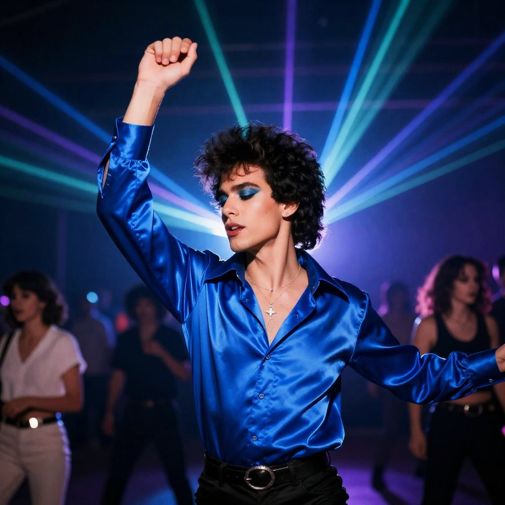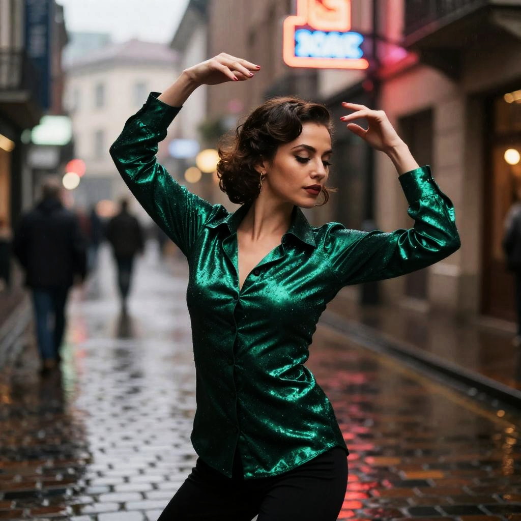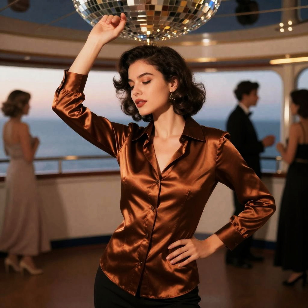 Flapper girl in floral pattern satin disco shirt with wide collars, dancing under a 1920s speakeasy with vintage decor