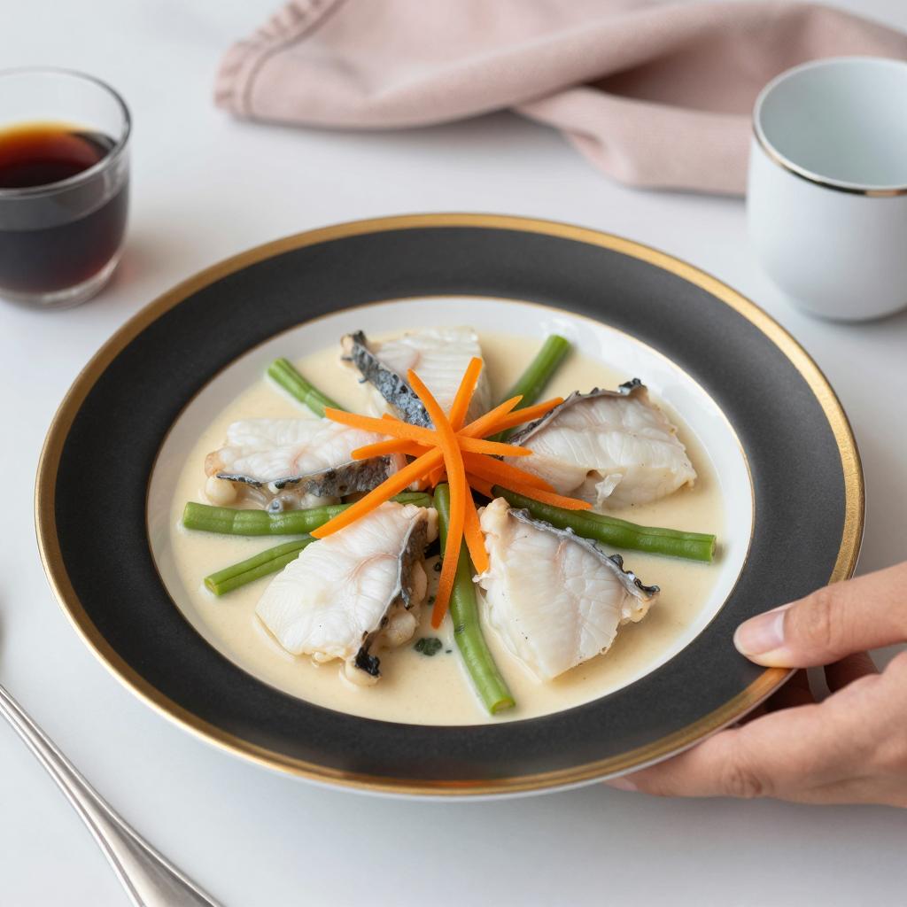 A gourmet dish featuring four pieces of white fish with skin on, served on a creamy soup base. The fish is arranged with green beans and topped with shredded orange carrots in the center. The meal is presented on an elegant black and gold-rimmed plate. A hand is holding the plate, with a small glass containing a dark beverage and a white cup with a silver rim placed nearby on the white table. A pink cloth is partially visible in the background.