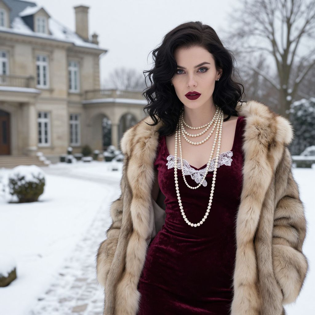 Photograph of a fair-skinned woman with wavy black hair and dark red lipstick, standing outdoors in a snowy landscape. She wears a dark burgundy velvet dress with a white lace bodice, layered with multiple pearl necklaces. Over her dress, she has on a luxurious, tan fur coat. In the background, there is a large, beige stone house with multiple windows and a snow-covered yard. The woman's intense gaze is directed at the camera. The contrast between her dark clothing and the white snow adds a dramatic effect to the image.