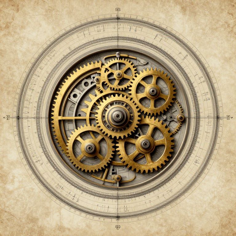 The image presents a highly detailed and intricate mechanical drawing, reminiscent of the inner workings of a complex machine or a journey through a labyrinthine system. At the center, a spiral of gears and cogs interlock, their metallic surfaces gleaming with a golden hue, suggesting precision and craftsmanship. Surrounding this central spiral are multiple concentric circles, each adorned with intricate patterns and mathematical equations, hinting at the underlying principles of mechanics and engineering. The background is a textured, aged paper, adding a sense of antiquity and depth to the scene. The overall composition is symmetrical, with elements arranged in a balanced, harmonious manner, creating a sense of order and complexity. The interplay of colors, from the warm gold of the gears to the muted tones of the aged paper, enhances the visual richness of the image, while the spatial relationships between the various components suggest a meticulous and thoughtful design.