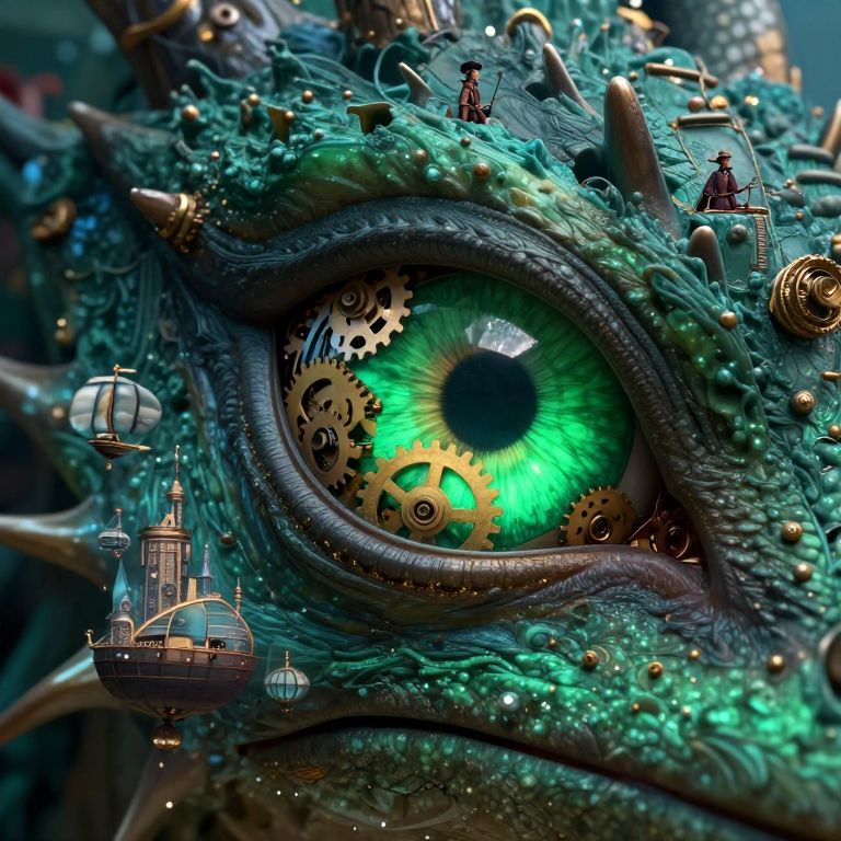 Imagine a captivating steampunk digital illustration featuring an up-close view of a majestic dragon's eye, with vibrant emerald green irises reflecting intricate gears and cogs forming its mechanical eyelid. This enigmatic creature gazes upon a mesmerizing scene where Victorian-era inventors and airships coexist harmoniously within a fantastical floating cityscape, evoking both awe and apprehension as it observes this world that seamlessly blends technology and magic.