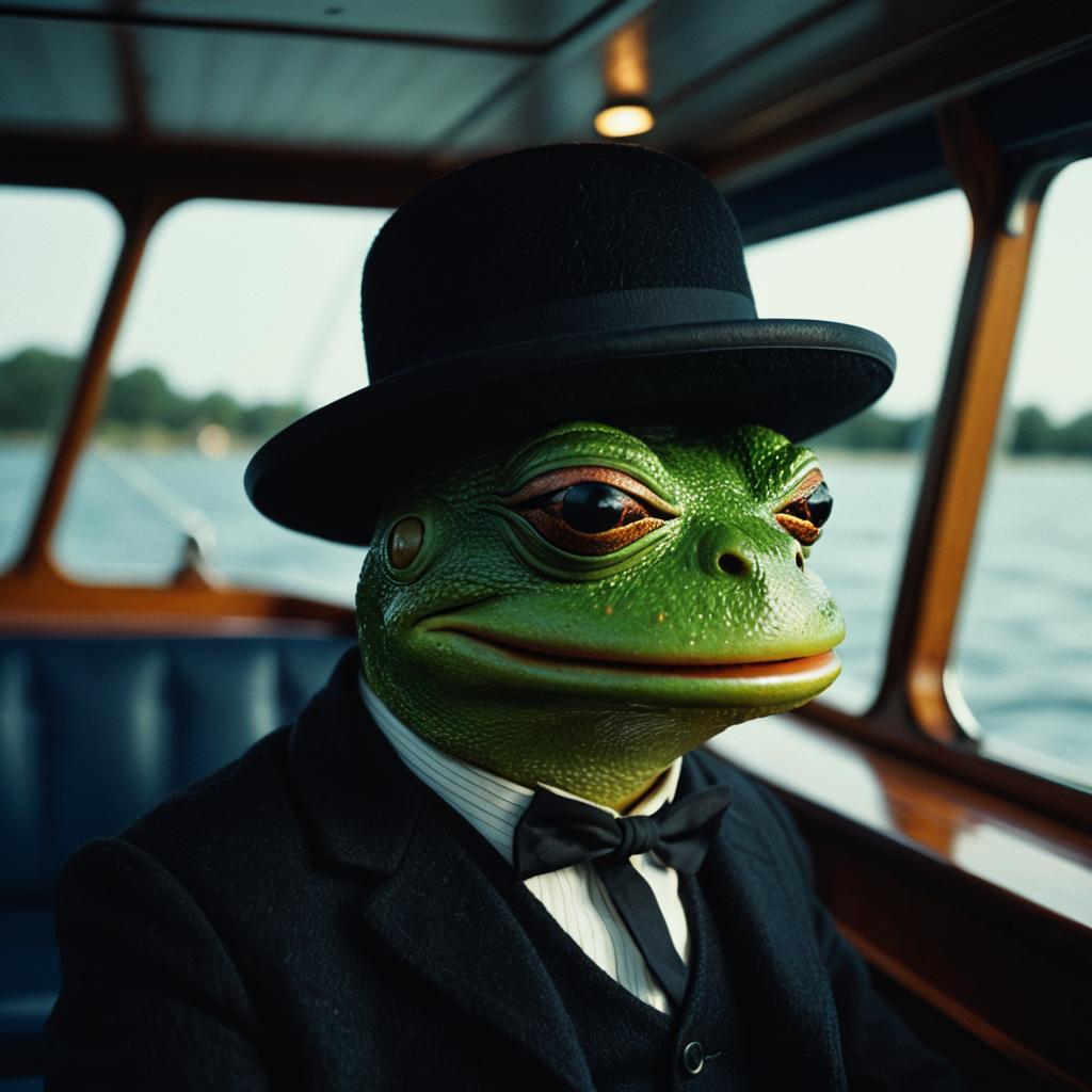 Pepe the Frog in a bowler hat, on a boat, intricate details, cinematic lighting, editorial photography, shot on 35mm, moody lighting, backlight, depth of field, 32k, hyper-detailed