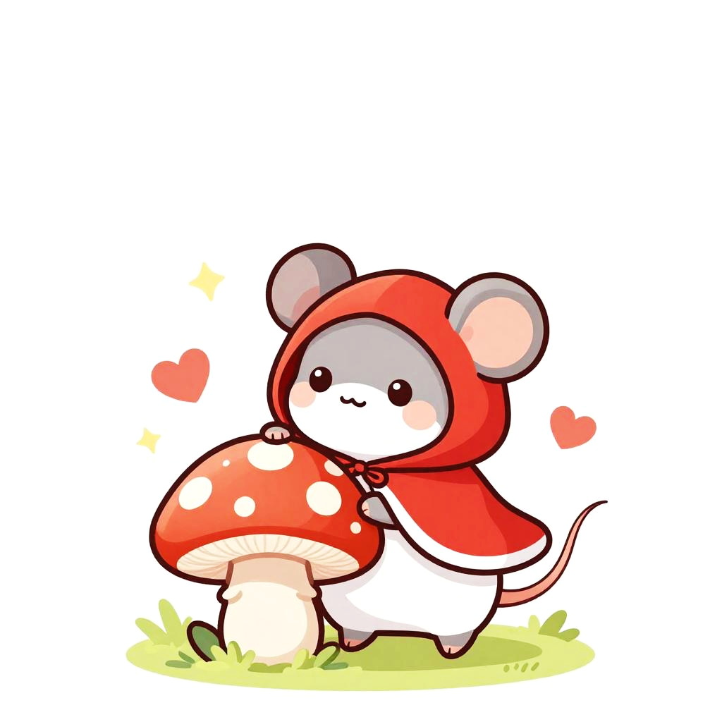 Cute Cartoon Mouse in Red Hooded Cape with Red-Spotted Mushroom