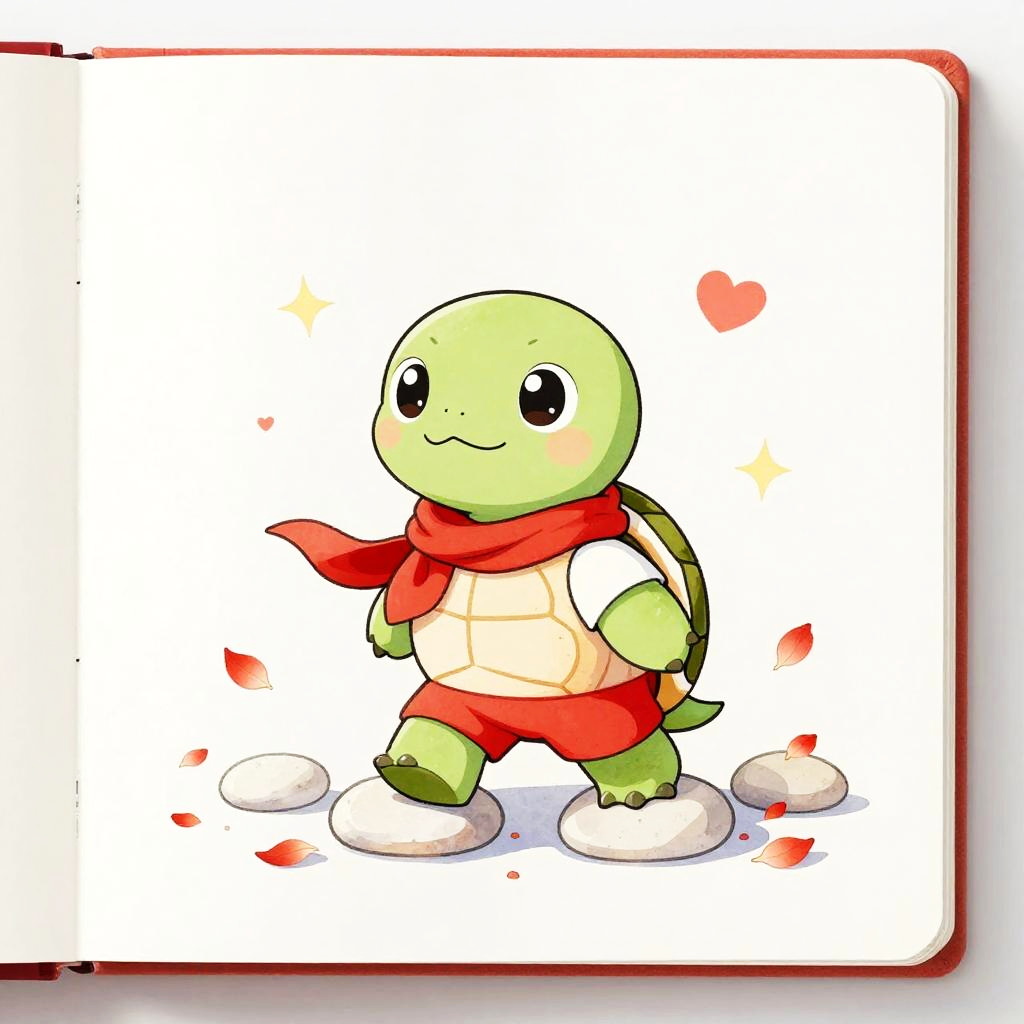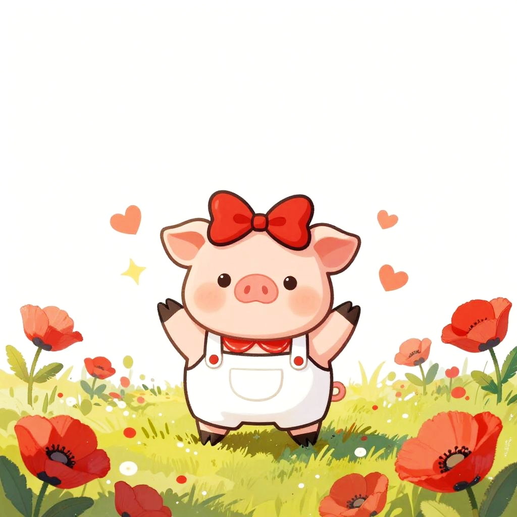 A clean vector illustration of a cute cartoon mouse with round ears, wearing a red hooded cape with white trim. The mouse is peeking out from behind a large white mushroom with red spots. The scene is set in a softly lit glade with green grass, featuring small hearts and sparkles floating around, creating a whimsical and playful atmosphere. The image uses gentle lighting, soft shadows, and crisp details with a polished finish.