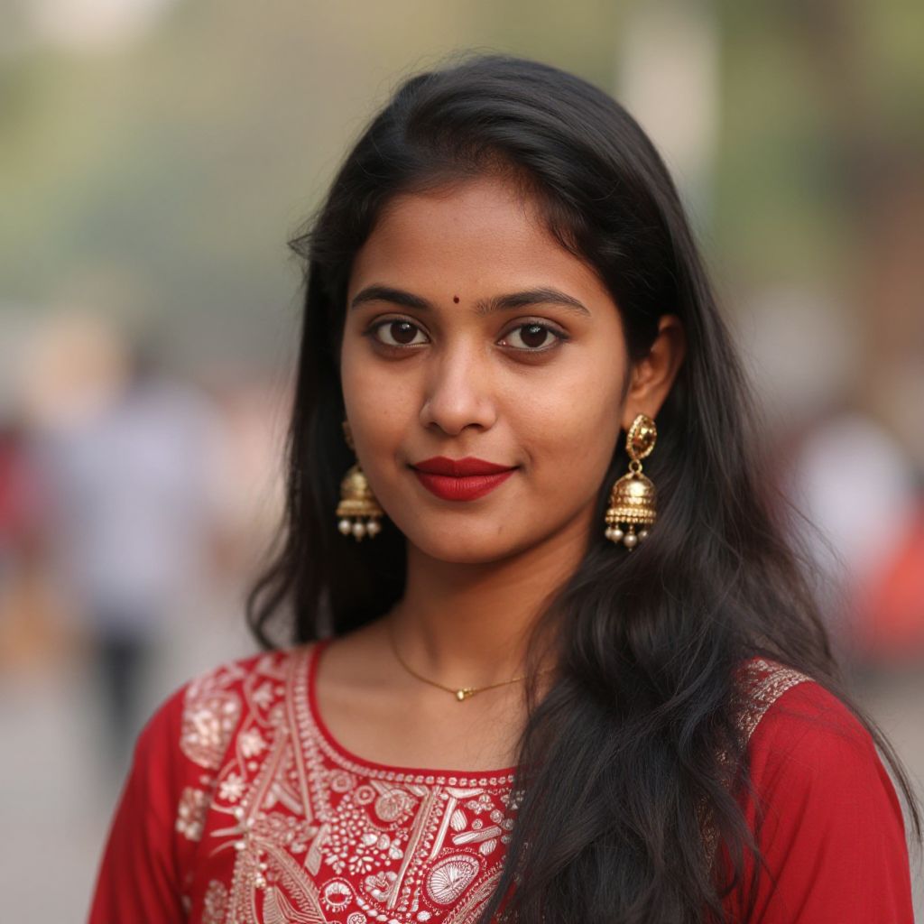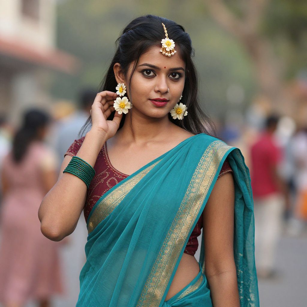 Photograph of a young Indian woman with long black hair, wearing traditional gold jewelry, a patterned black and gold saree, standing in a blurred
