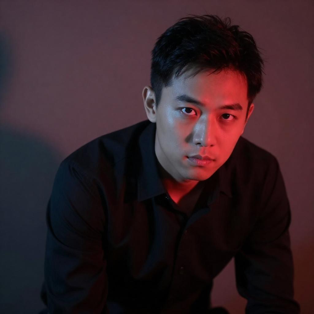 Black and white close-up portrait of two Asian men in shadowy high-contrast lighting. The man in the foreground has intense facial features and red glowing eyes, creating a mysterious and dramatic atmosphere. The second man is partially visible in the background with a softer focus and a curious expression, wearing dark clothing against a dark background.